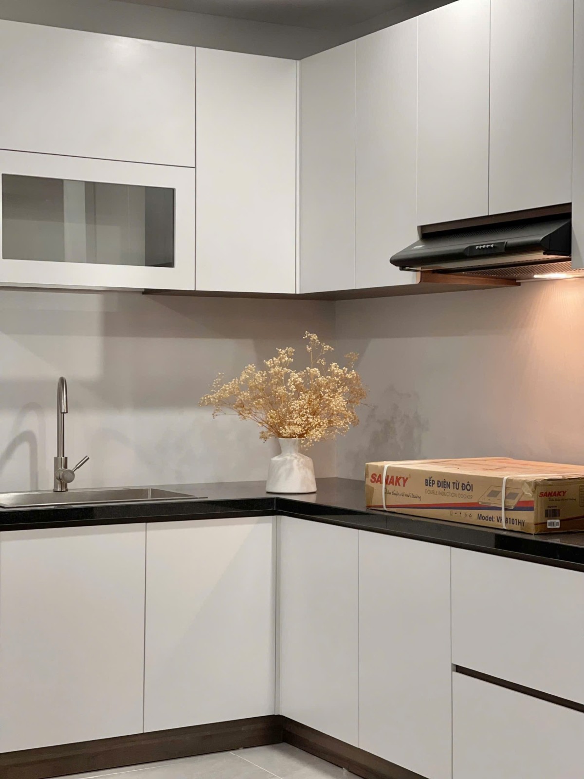 Căn hộ 1 phòng ngủ được thiết kế hiện đại, full nội thất tiện nghi: giường, tủ, máy lạnh, tủ lạnh, bàn ghế, bếp nấu,...