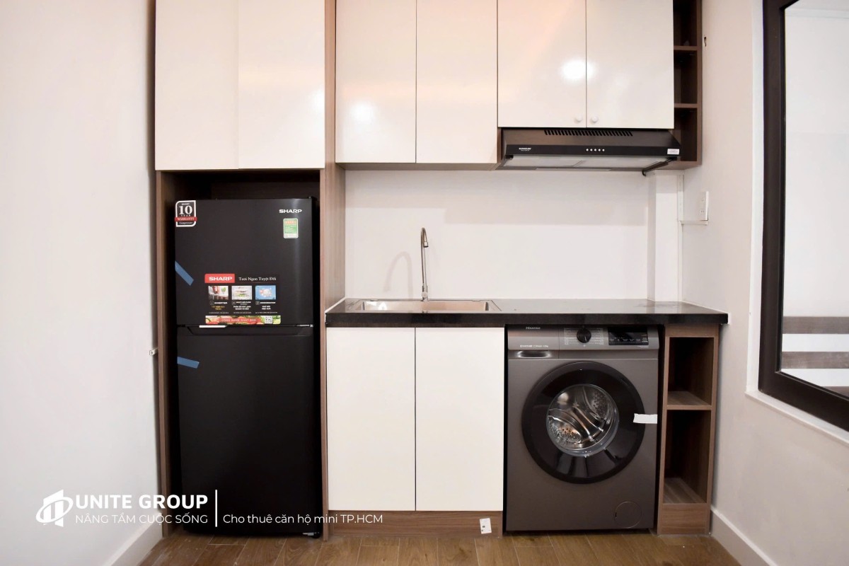 •Khu bếp riêng, tủ bếp trên dưới, bếp điện, hút mùi, tủ lạnh