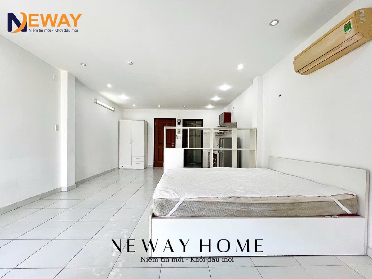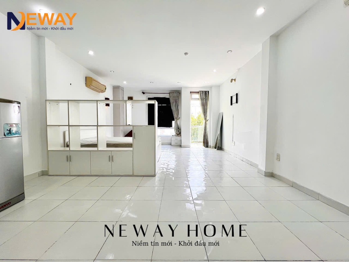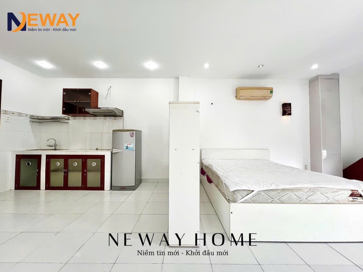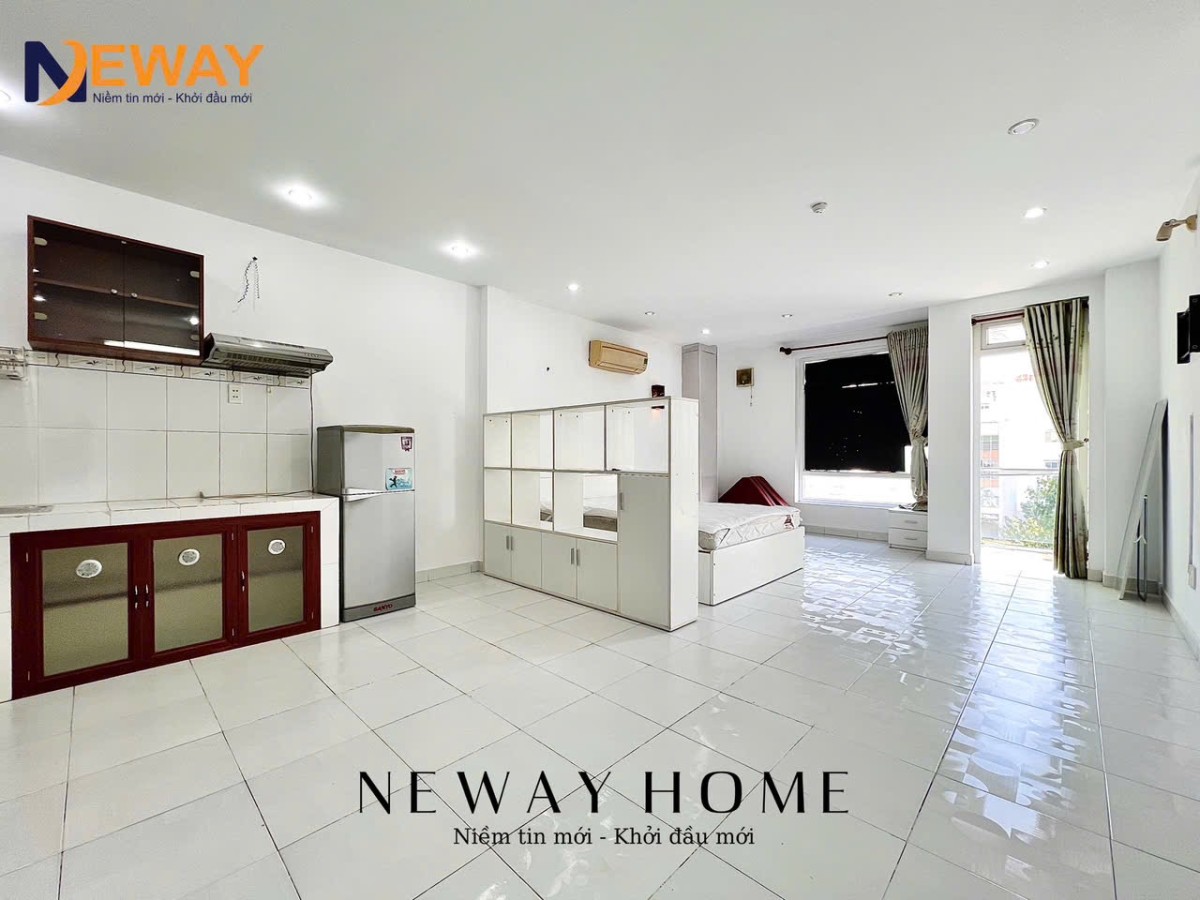 Căn studio hiện đại với ban công riêng được full nội thất, gồm: giường nệm, tủ quần áo, sofa, TV, bàn ăn, máy lạnh, khu bếp đầy đủ thiết bị, phòng tắm sạch sẽ với nước nóng lạnh. Ban công và cửa sổ lớn đón ánh sáng tự nhiên, tạo không gian sống thoáng mát và tiện nghi.