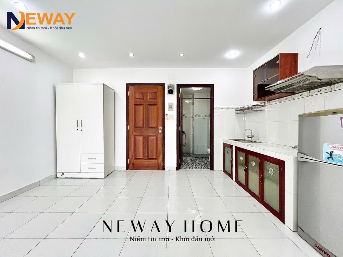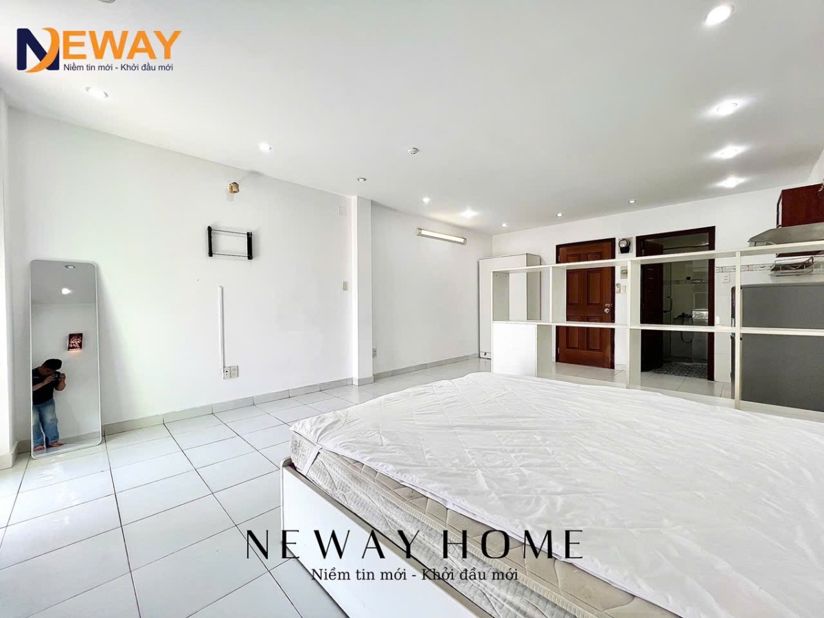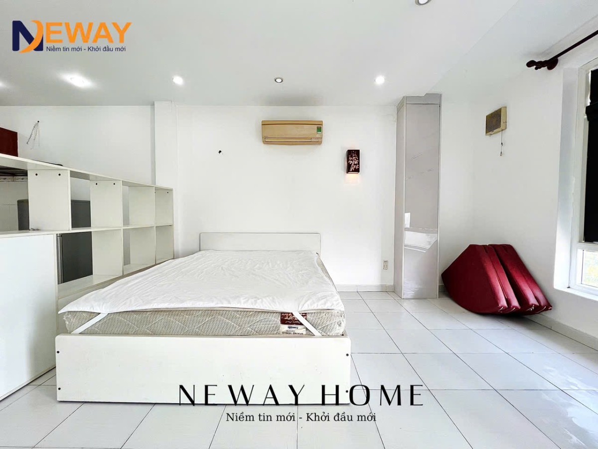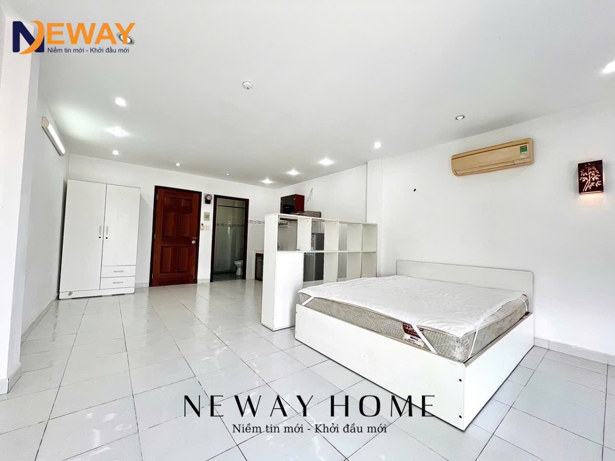Căn studio hiện đại với ban công riêng được full nội thất, gồm: giường nệm, tủ quần áo, sofa, TV, bàn ăn, máy lạnh, khu bếp đầy đủ thiết bị, phòng tắm sạch sẽ với nước nóng lạnh. Ban công và cửa sổ lớn đón ánh sáng tự nhiên, tạo không gian sống thoáng mát và tiện nghi.