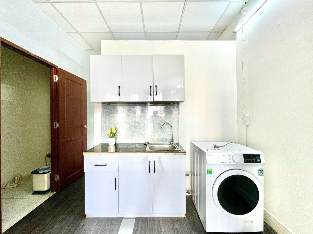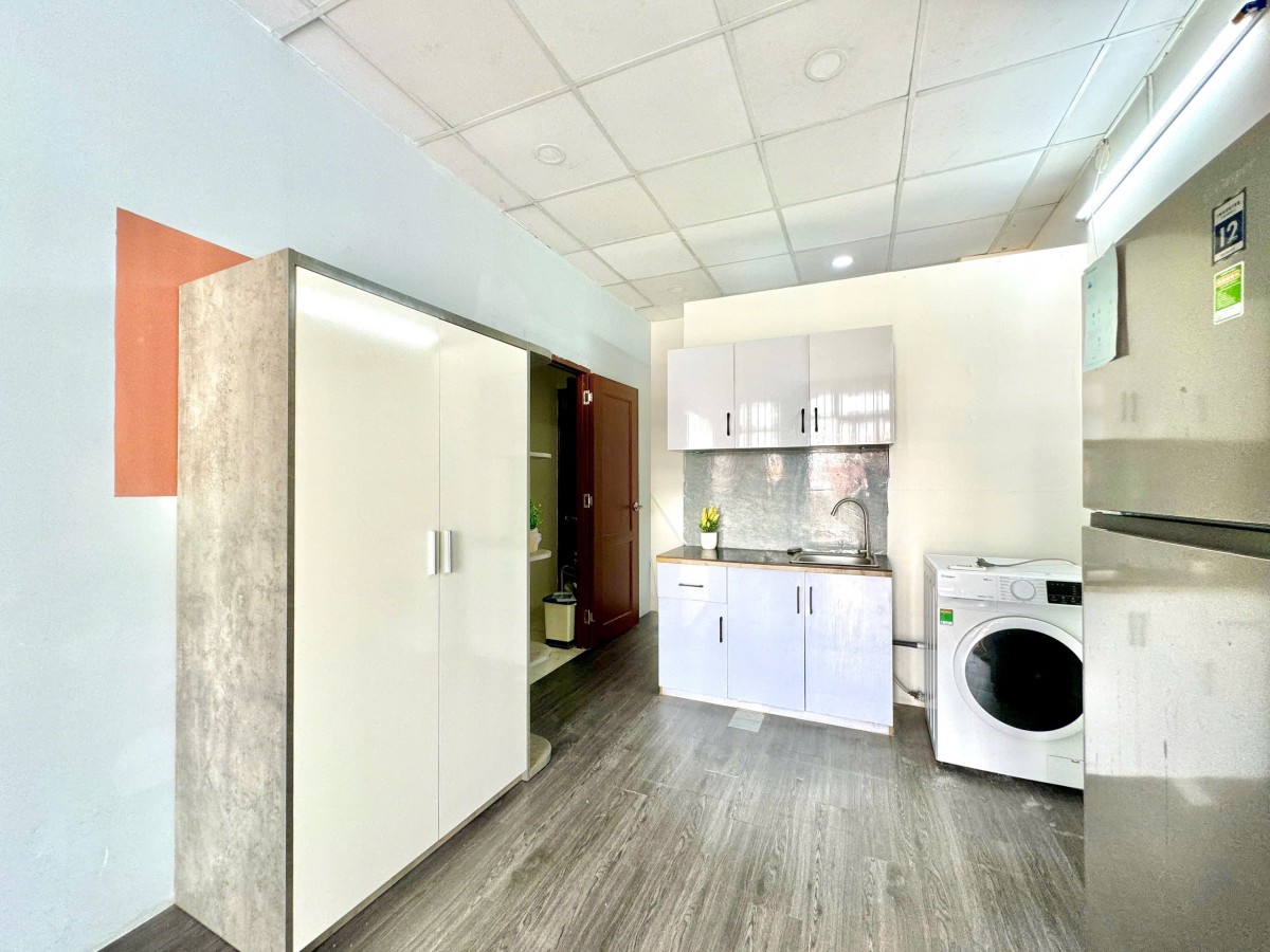 Căn hộ studio được thiết kế hiện đại, không gian gọn gàng nhưng thoáng mát, có cửa sổ lớn đón ánh sáng tự nhiên và gió trời. Nội thất được trang bị đầy đủ, chỉ cần xách vali vào ở, bao gồm: giường ngủ, nệm cao cấp, tủ quần áo, bàn làm việc, sofa, máy lạnh, TV, tủ lạnh, máy giặt, khu bếp nấu ăn, tủ bếp và các vật dụng cơ bản.