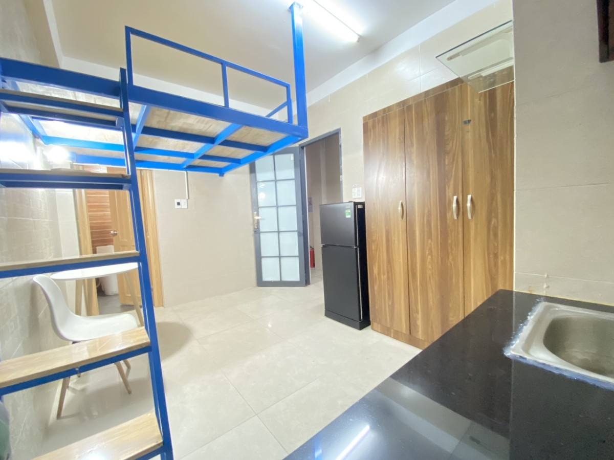 - *Tiện nghi sẵn:* WC riêng khép kín (nóng lạnh, vòi sen, lavabo), máy lạnh, tủ lạnh 2 cửa, tủ quần áo gỗ 3 cánh, bếp + bồn rửa riêng, tủ bếp trên/dưới, bàn ghế.