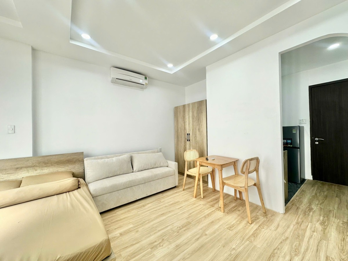 Full nội thất: giường, nệm, sofa, bàn ghế, tủ, máy lạnh, tivi, rèm cửa, toilet riêng.
