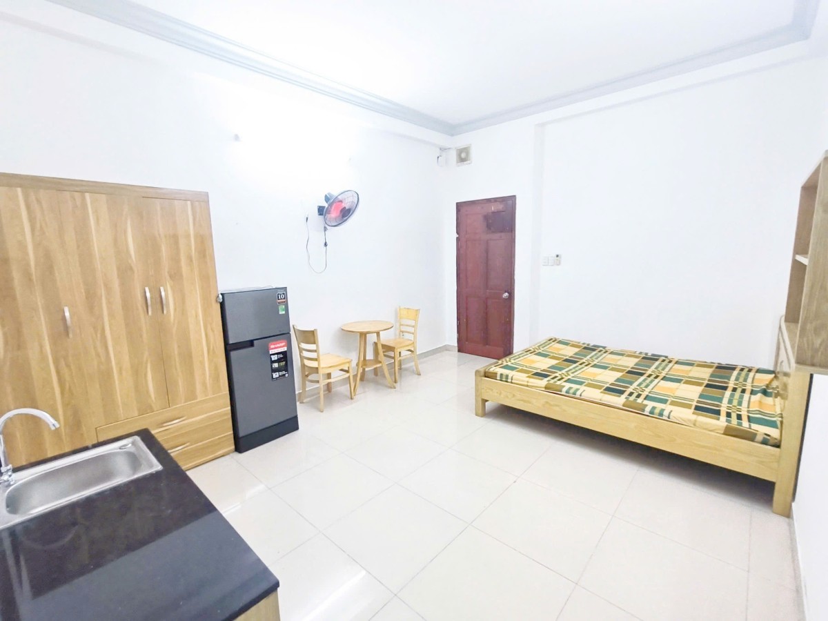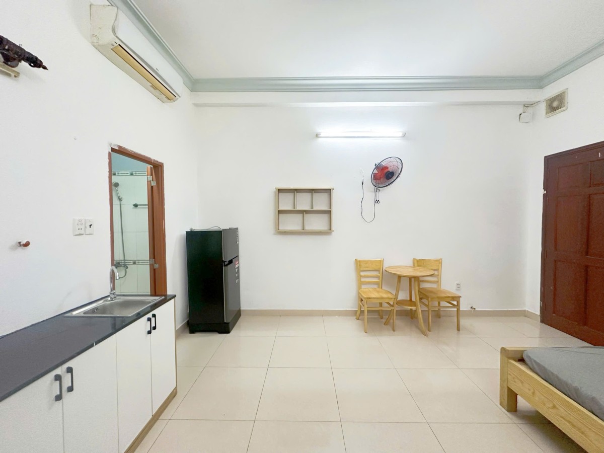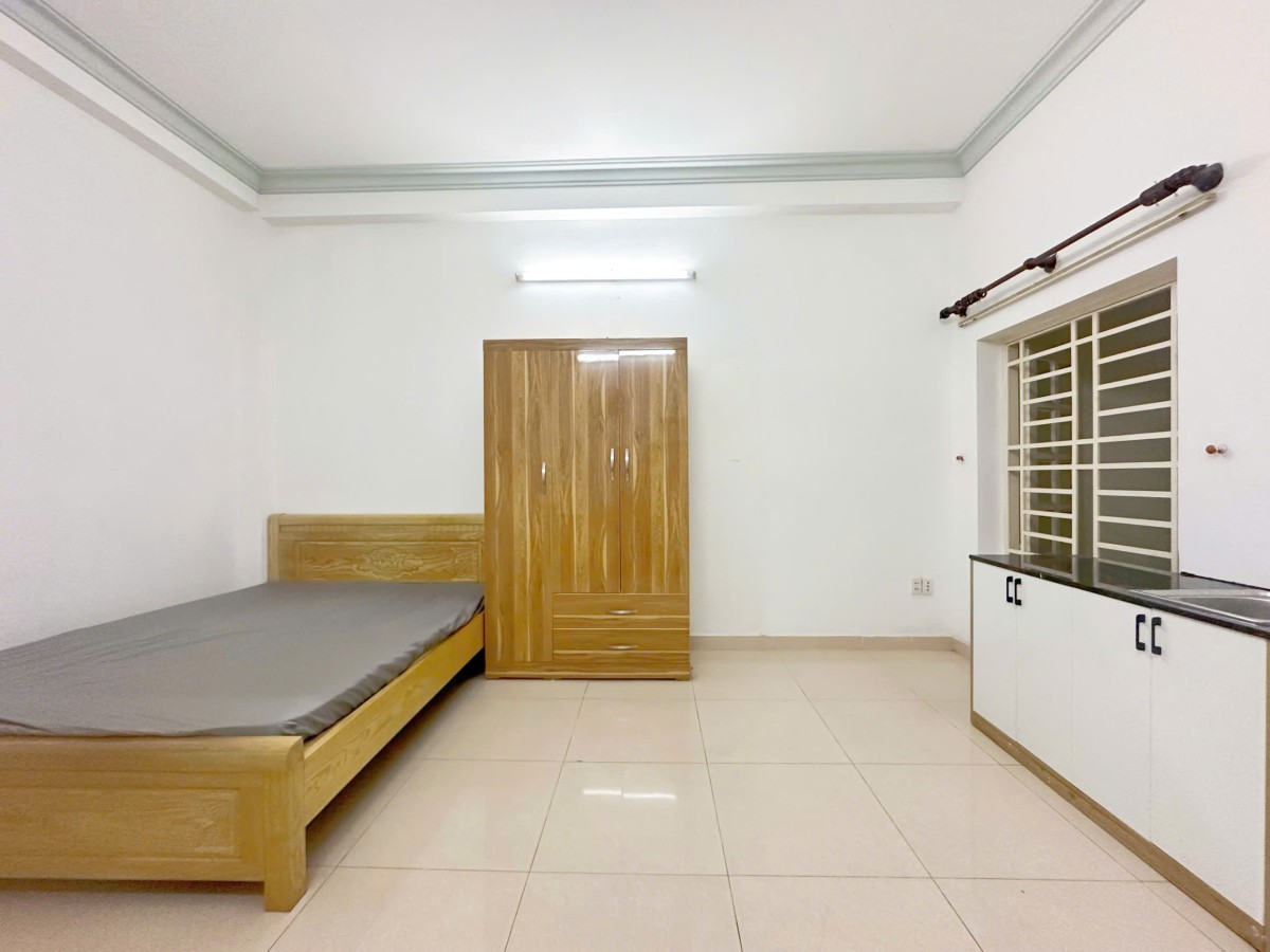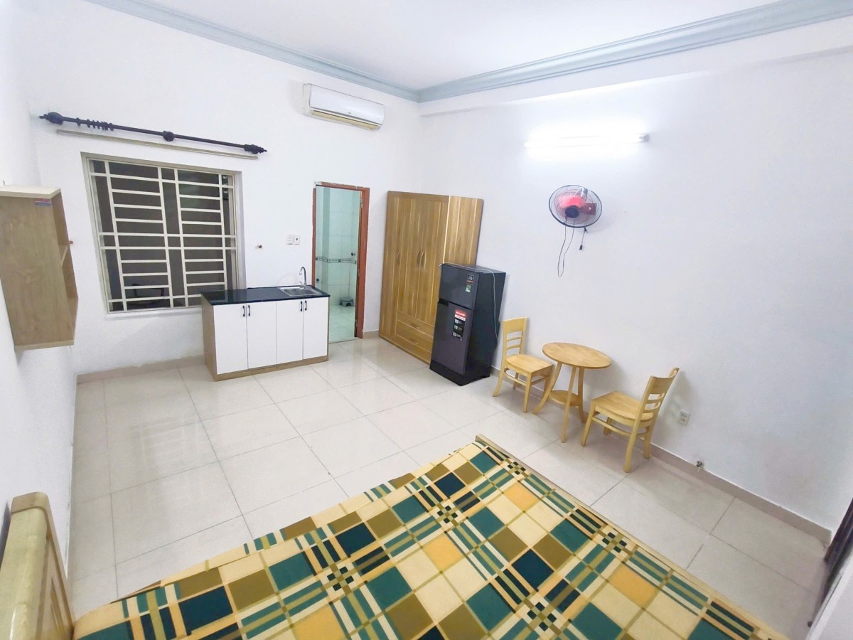 Phòng đẹp, đầy đủ tiện nghi: giường, tủ, máy lạnh, tủ lạnh, kệ bếp riêng – chỉ cần xách vali vào ở.