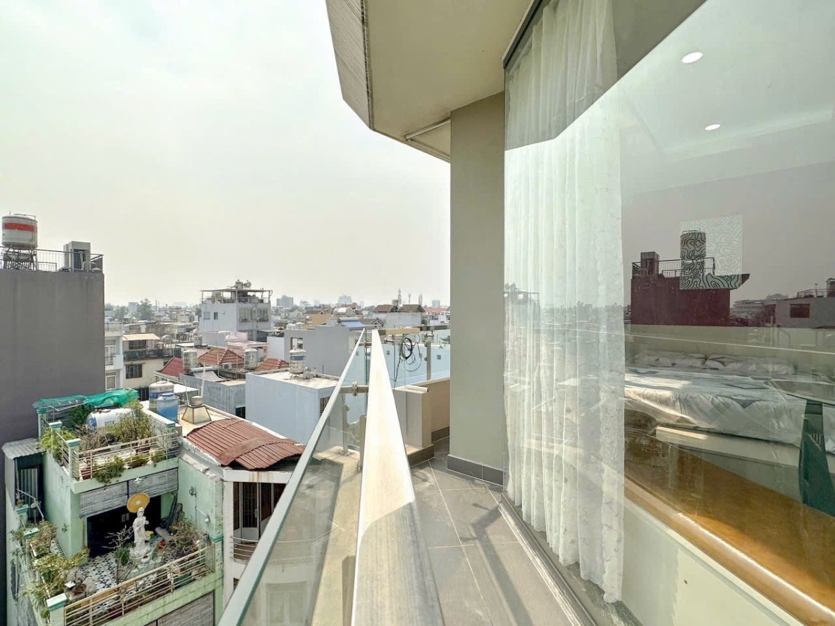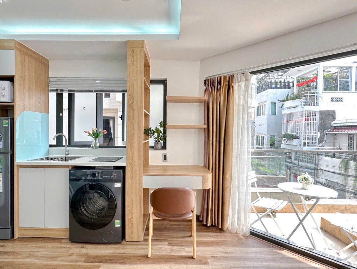 Căn studio có ban công riêng, view thoáng đẹp, nhiều ánh sáng tự nhiên.
