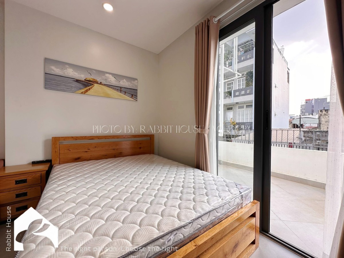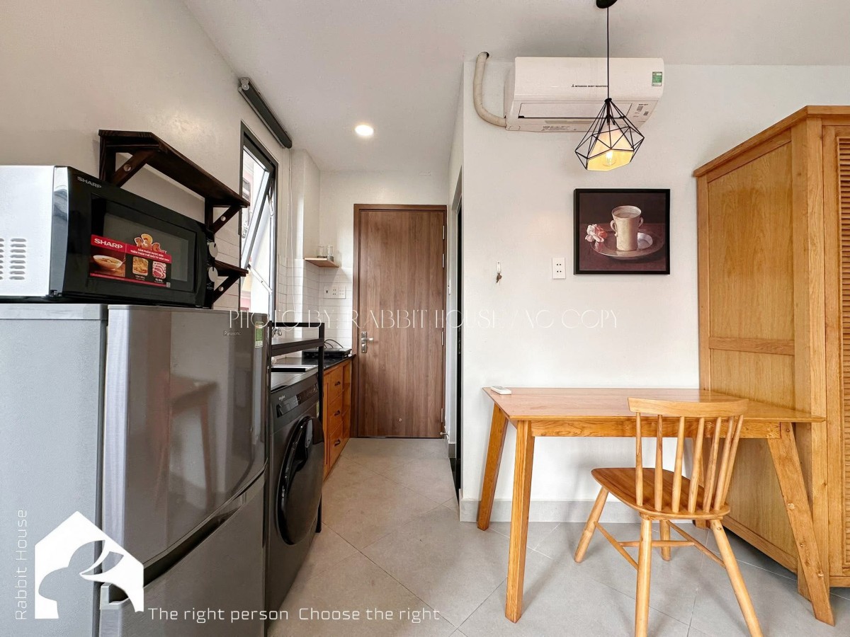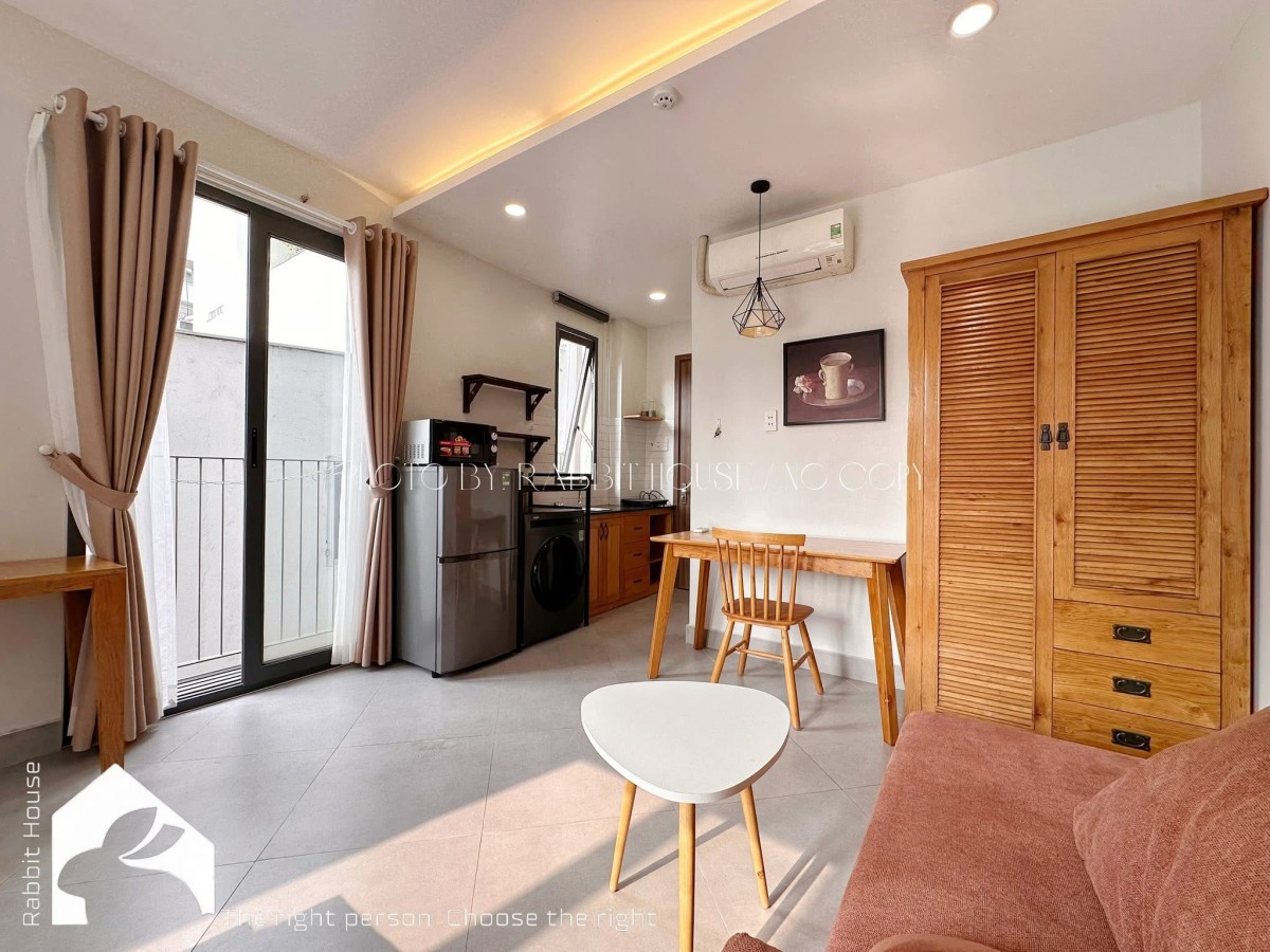 Căn hộ được thiết kế hiện đại, không gian mở, có ban công riêng thoáng mát, đón ánh sáng tự nhiên. Nội thất full đầy đủ gồm: giường nệm, tủ quần áo, bàn làm việc, sofa, máy lạnh, Tivi, và máy giặt riêng trong phòng rất tiện lợi. Khu bếp được trang bị tủ bếp, bếp điện, tủ lạnh, lò vi sóng và dụng cụ nấu ăn cơ bản. Phòng tắm sạch sẽ, hiện đại, có máy nước nóng.