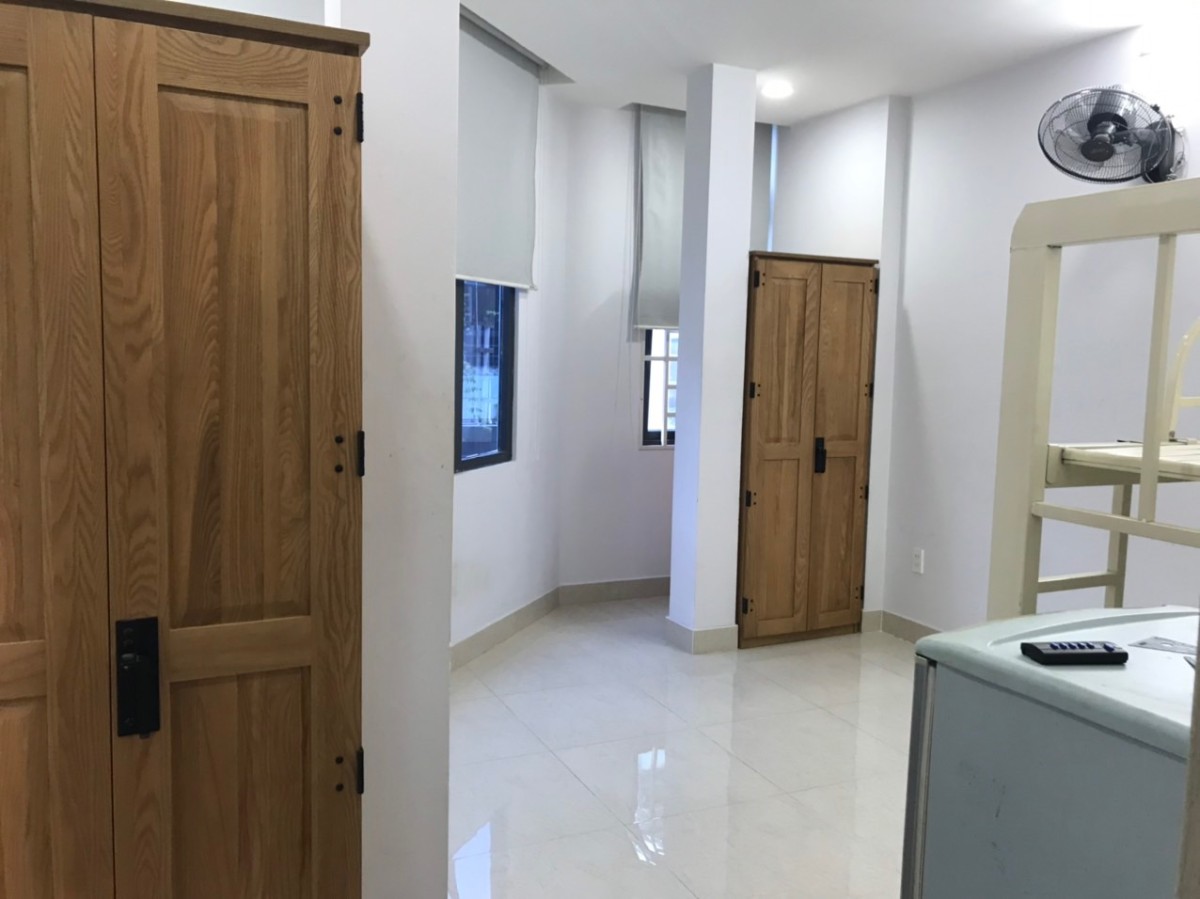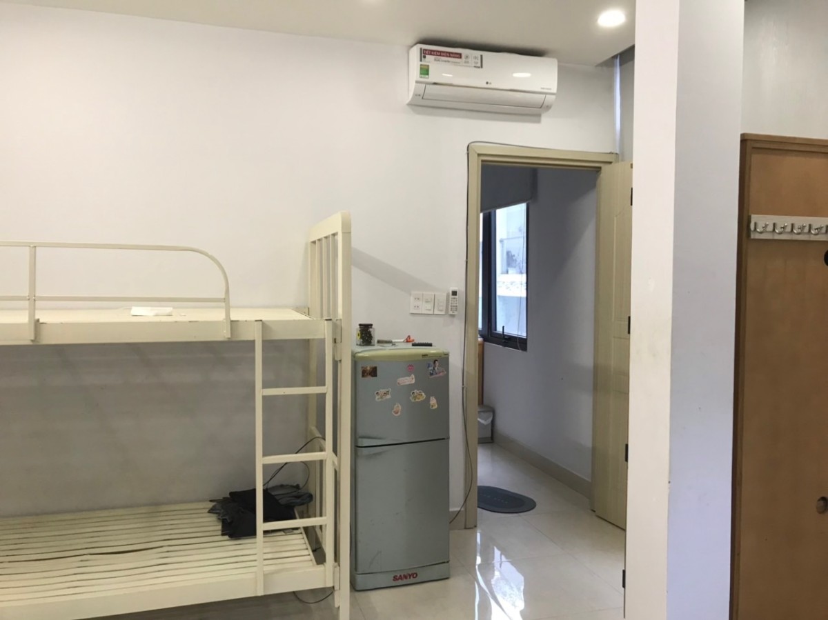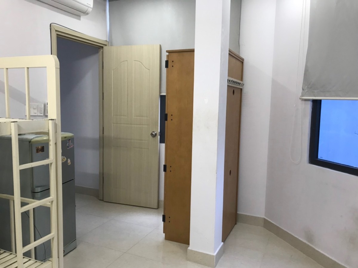 Phòng diện tích: 25m2, mới xây dựng, có giường, tủ, máy lạnh đời mới.
